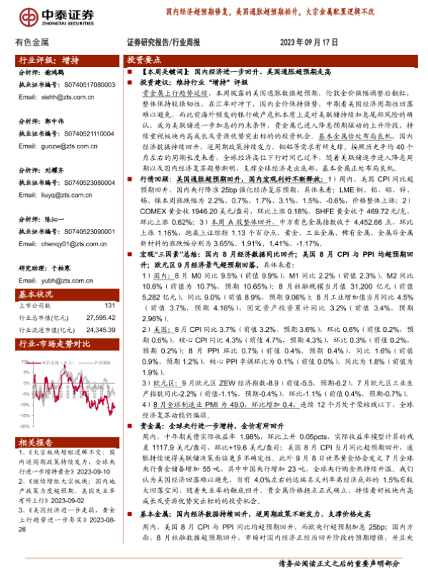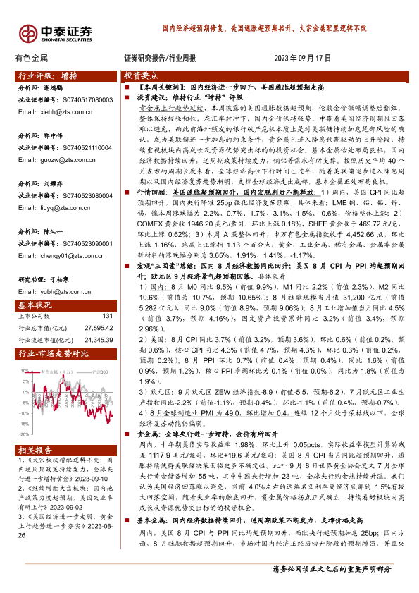 【中泰证券】【20230917】20230917-中泰证券-有色金属行业周报:国内经济超预期修复,美国通胀超预期抬升,大宗金属配置逻辑不改-32页