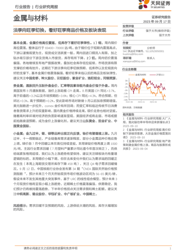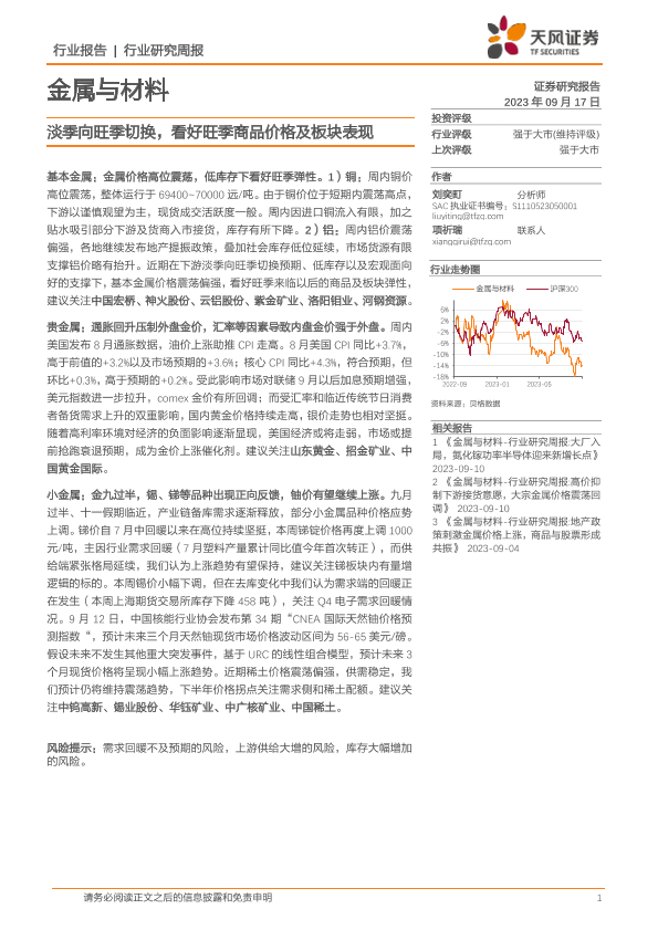 【天风证券】【20230917】20230917-天风证券-金属与材料行业研究周报:淡季向旺季切换,看好旺季商品价格及板块表现-14页