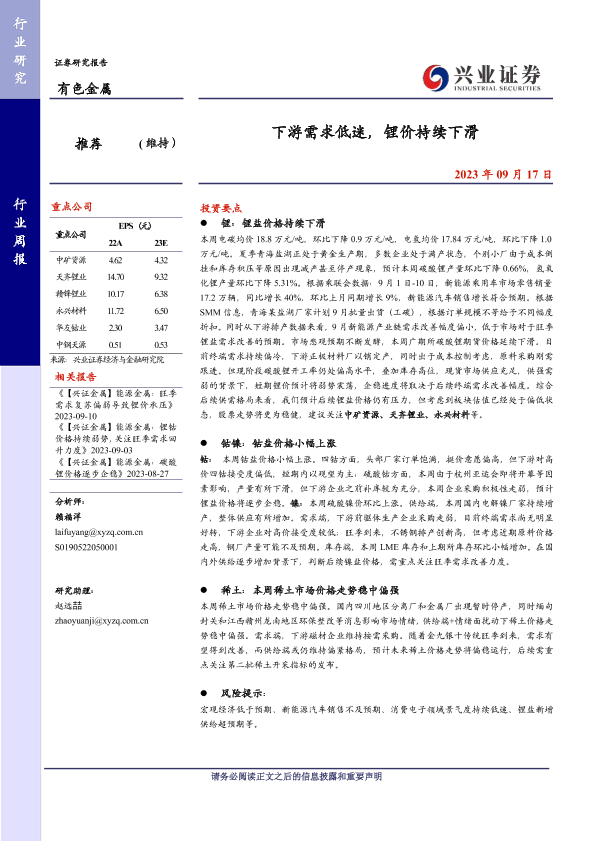 【兴业证券】【20230917】20230917-兴业证券-有色金属行业周报:下游需求低迷,锂价持续下滑-18页
