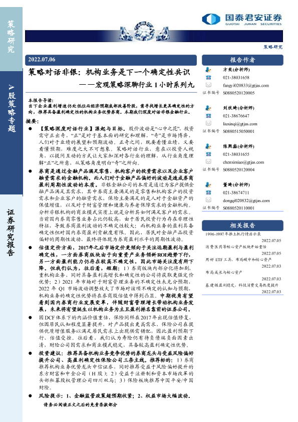 【国泰君安证券】【20220706】策略对话非银:机构业务是下一个确定性共识-18页