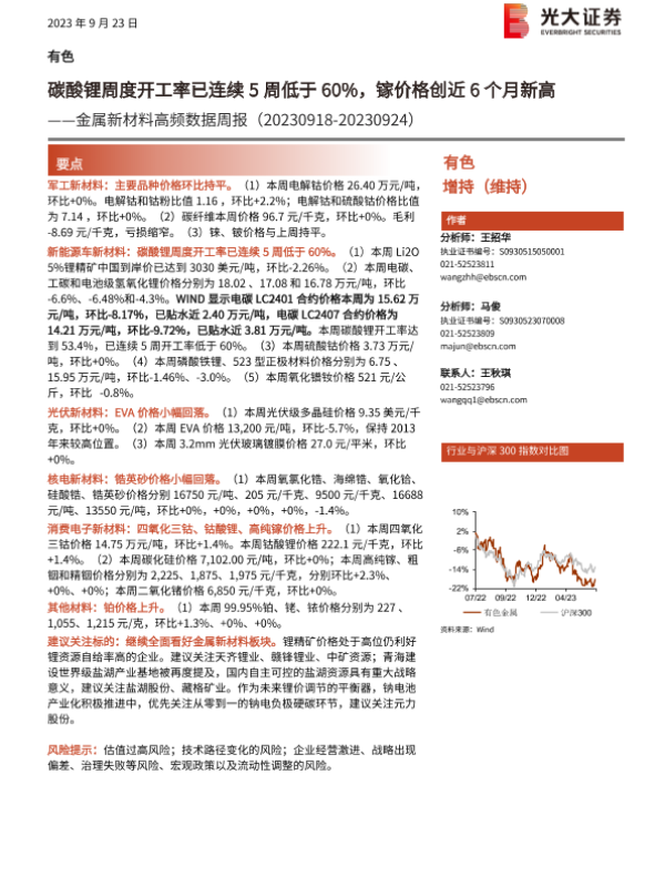 【光大证券】【20230923】20230923-光大证券-金属新材料高频数据周报:碳酸锂周度开工率已连续5周低于60%,镓价格创近6个月新高-20页