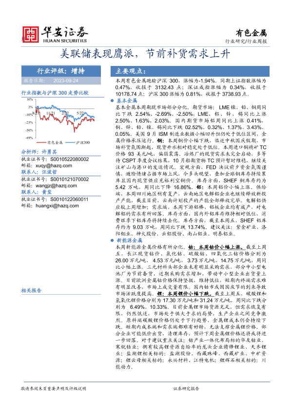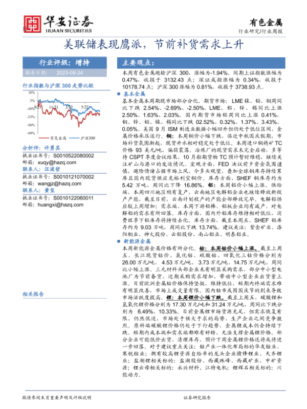 【华安证券】【20230924】20230924-华安证券-有色金属行业周报:美联储表现鹰派,节前补货需求上升-15页