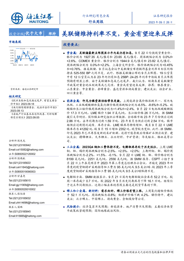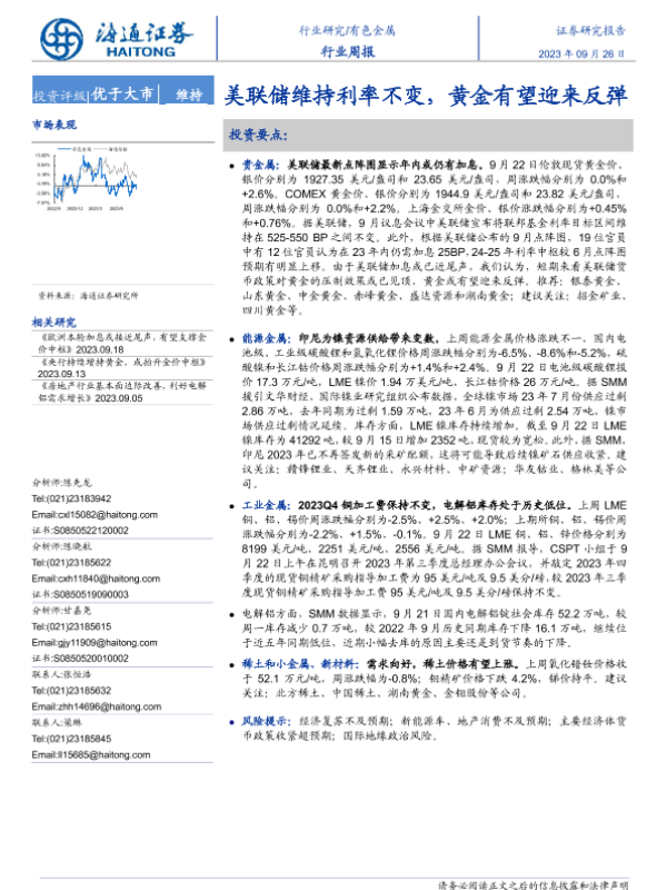 【海通证券】【20230926】20230926-海通证券-有色金属行业周报:美联储维持利率不变,黄金有望迎来反弹-14页