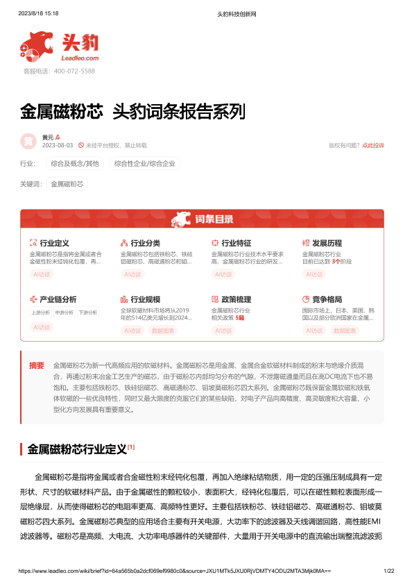 【头豹研究院】【20230803】金属磁粉芯 头豹词条报告系列-22页
