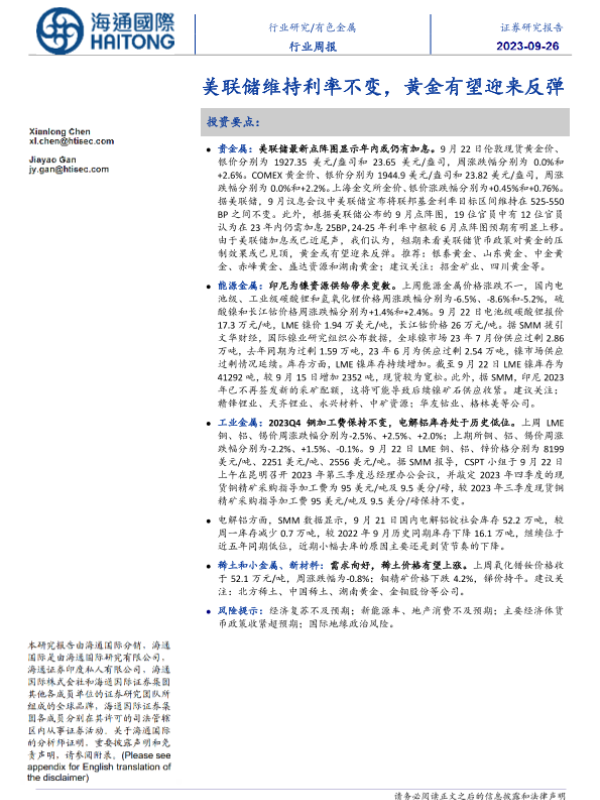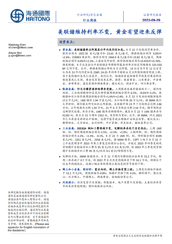 【海通国际】【20230926】20230926-海通国际-有色金属行业周报:美联储维持利率不变,黄金有望迎来反弹-21页