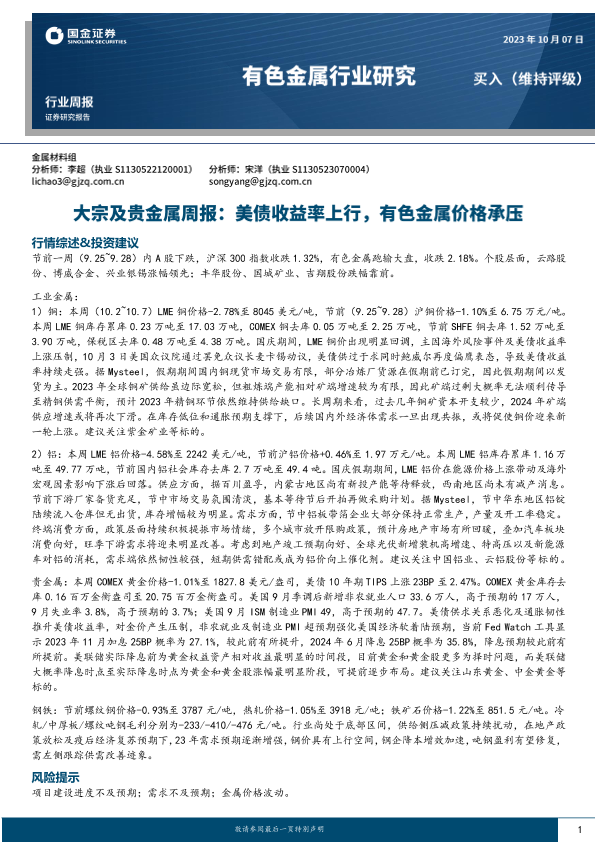 【国金证券】【20231007】国金证券-大宗及贵金属周报:美债收益率上行,有色金属价格承压-13页