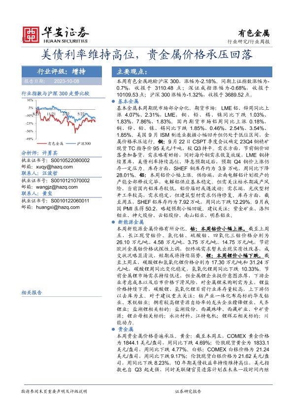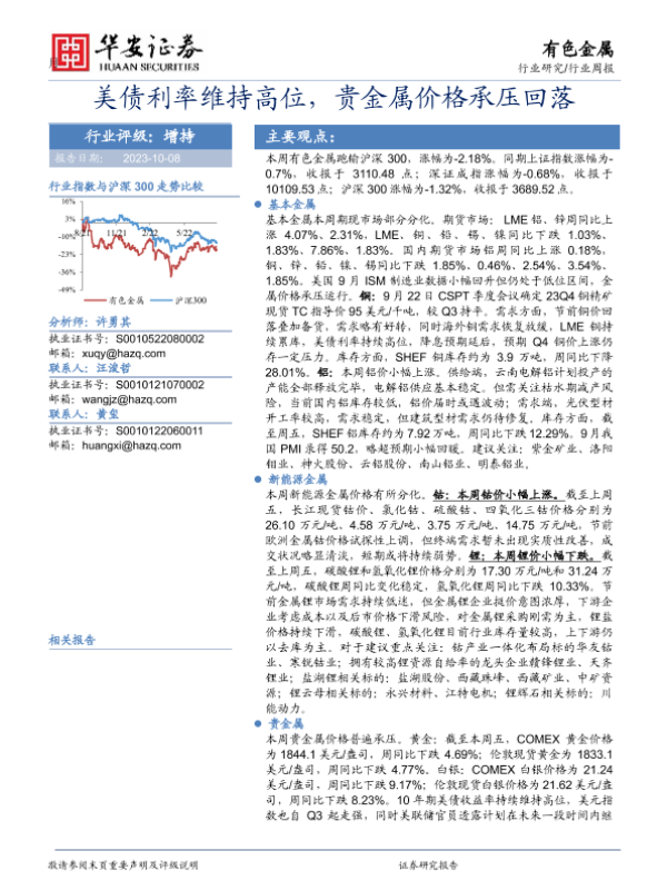 【华安证券】【20231008】20231008-华安证券-有色金属行业周报:美债利率维持高位,贵金属价格承压回落-15页