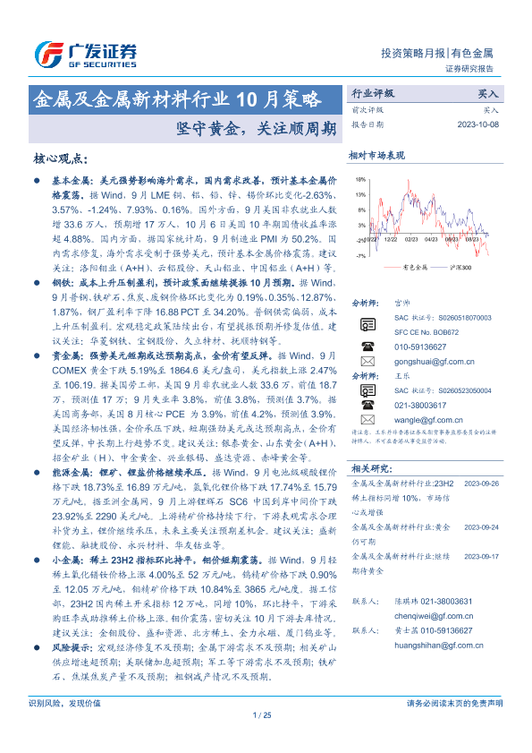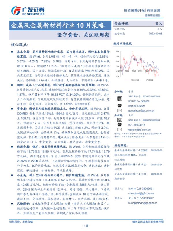 【广发证券】【20231008】金属及金属新材料行业10月策略:坚守黄金,关注顺周期-25页