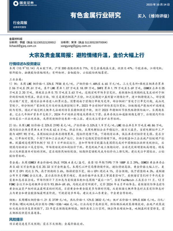 【国金证券】【20231014】国金证券-大宗及贵金属周报:避险情绪升温,金价大幅上行-14页
