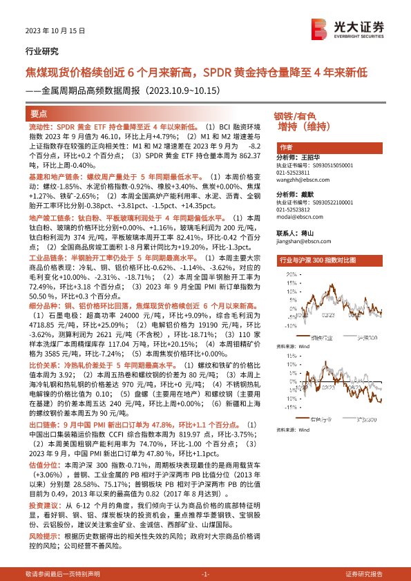 【光大证券】【20231015】20231015-光大证券-金属周期品高频数据周报:焦煤现货价格续创近6个月来新高,SPDR黄金持仓量降至4年来新低-25页