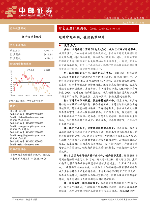 【中邮证券】【20231014】20231014-中邮证券-有色金属行业周报:地缘冲突加剧,金价强势回升-15页