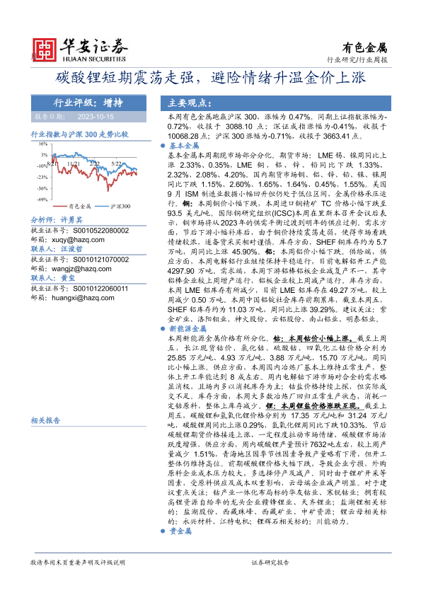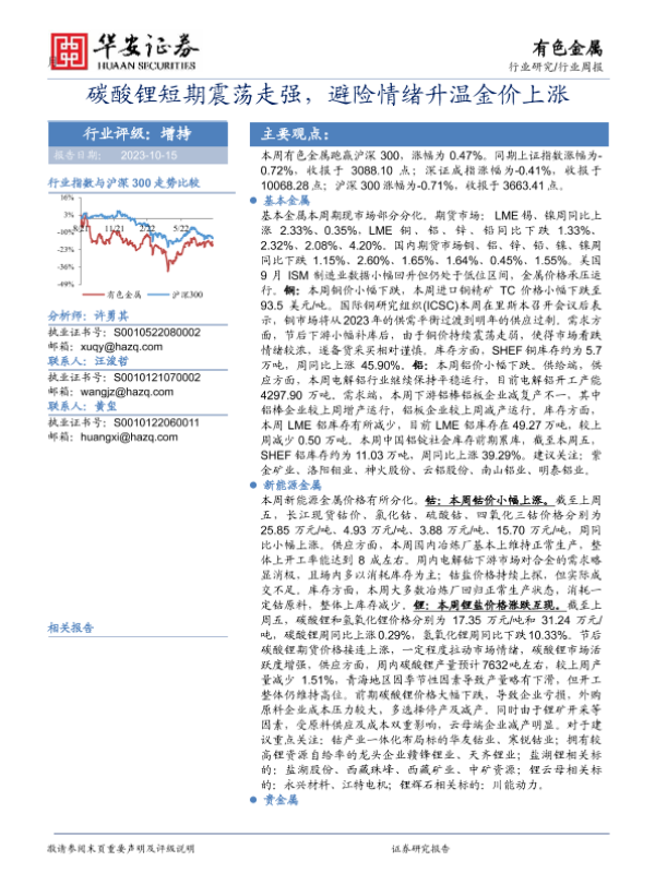 【华安证券】【20231015】20231015-华安证券-有色金属行业周报:碳酸锂短期震荡走强,避险情绪升温金价上涨-15页