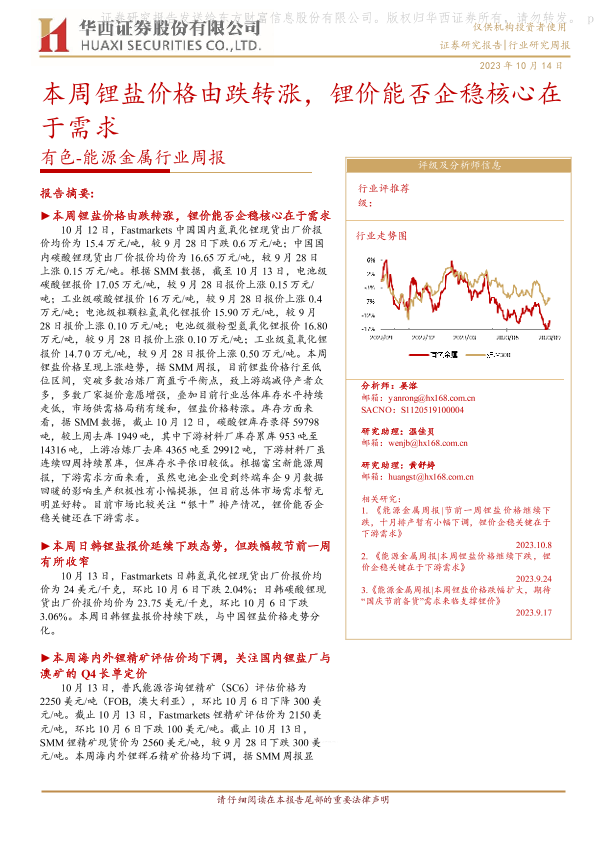【华西证券】【20231015】20231015-华西证券-有色-能源金属行业周报:本周锂盐价格由跌转涨,锂价能否企稳核心在于需求-24页