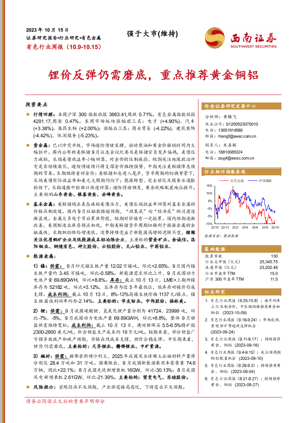 【西南证券】【20231015】20231015-西南证券-有色行业周报:锂价反弹仍需磨底,重点推荐黄金铜铝-23页