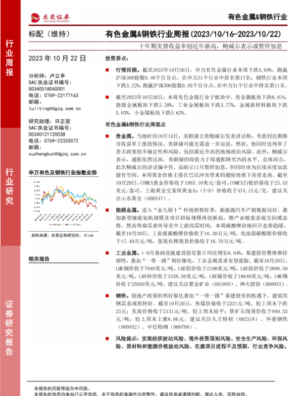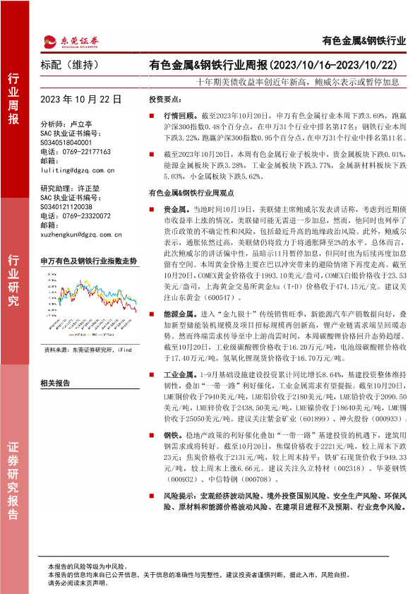 【东莞证券】【20231022】20231022-东莞证券-有色金属&钢铁行业周报:十年期美债收益率创近年新高,鲍威尔表示或暂停加息-14页