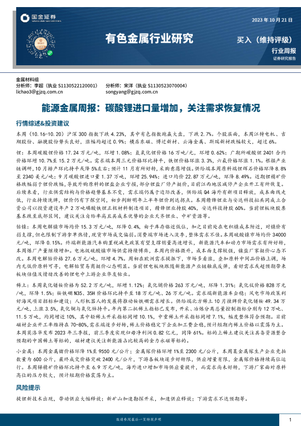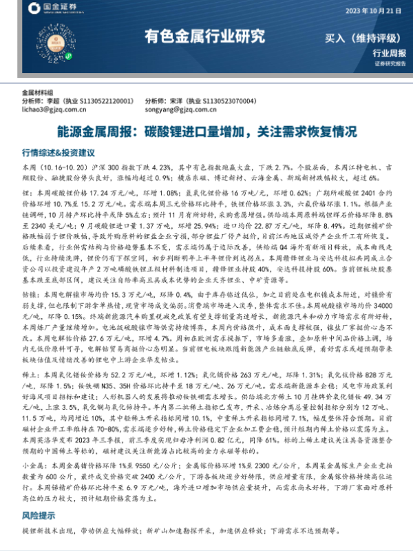 【国金证券】【20231021】20231021-国金证券-能源金属周报:碳酸锂进口量增加,关注需求恢复情况-16页