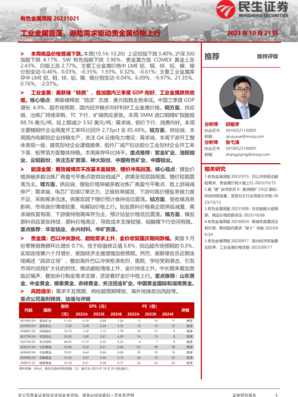 【民生证券】【20231021】20231021-民生证券-有色金属周报:工业金属震荡,避险需求驱动贵金属价格上行-26页