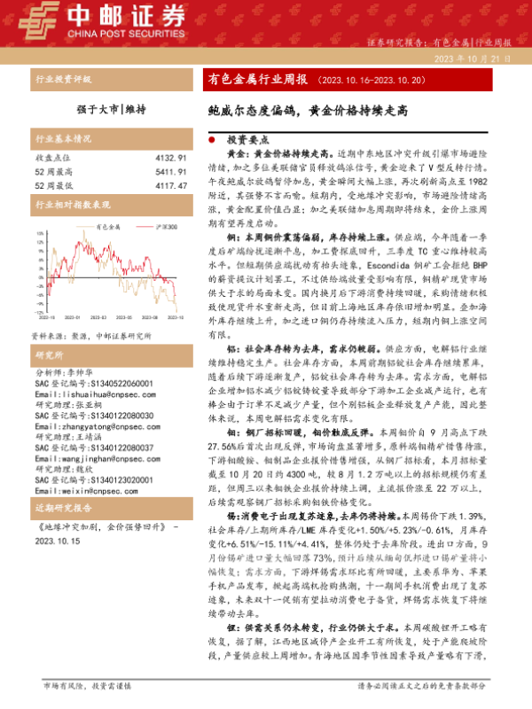 【中邮证券】【20231021】20231021-中邮证券-有色金属行业周报:鲍威尔态度偏鸽,黄金价格持续走高-15页