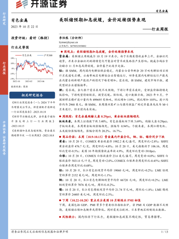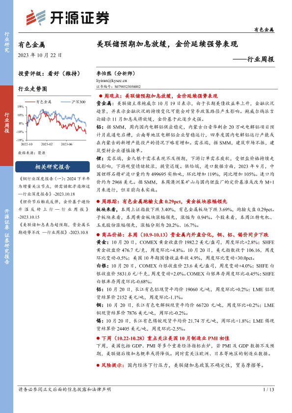 【开源证券】【20231022】20231022-开源证券-有色金属行业周报:美联储预期加息放缓,金价延续强势表现-13页