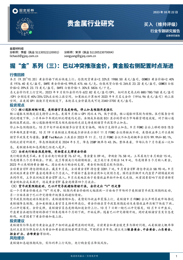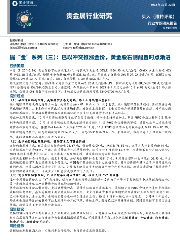 【国金证券】【20231022】20231022-国金证券-贵金属行业研究:掘“金”系列(三)-巴以冲突推涨金价,黄金股右侧配置时点渐进-24页