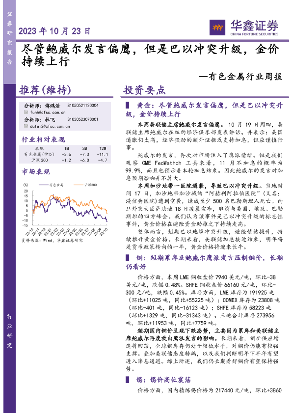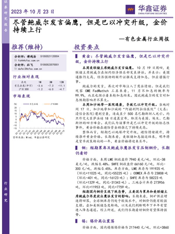 【华鑫证券】【20231023】20231023-华鑫证券-有色金属行业周报:尽管鲍威尔发言偏鹰,但是巴以冲突升级,金价持续上行-16页