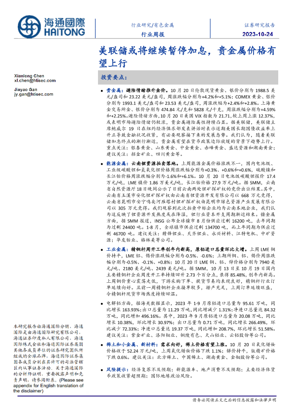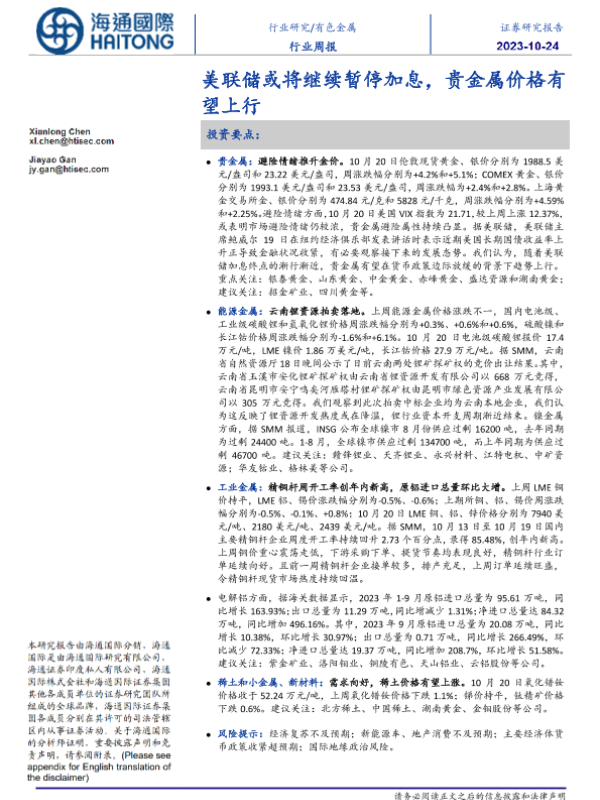 【海通国际】【20231024】20231024-海通国际-有色金属行业周报:美联储或将继续暂停加息,贵金属价格有望上行-21页