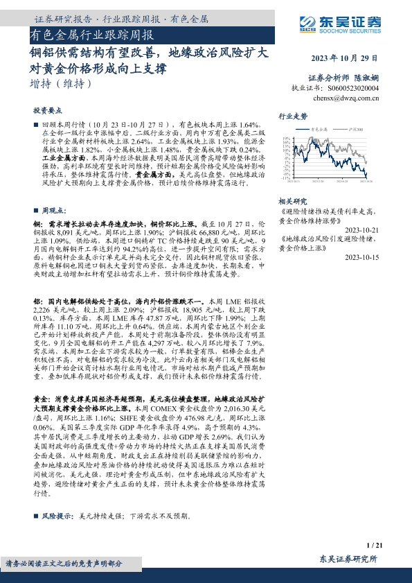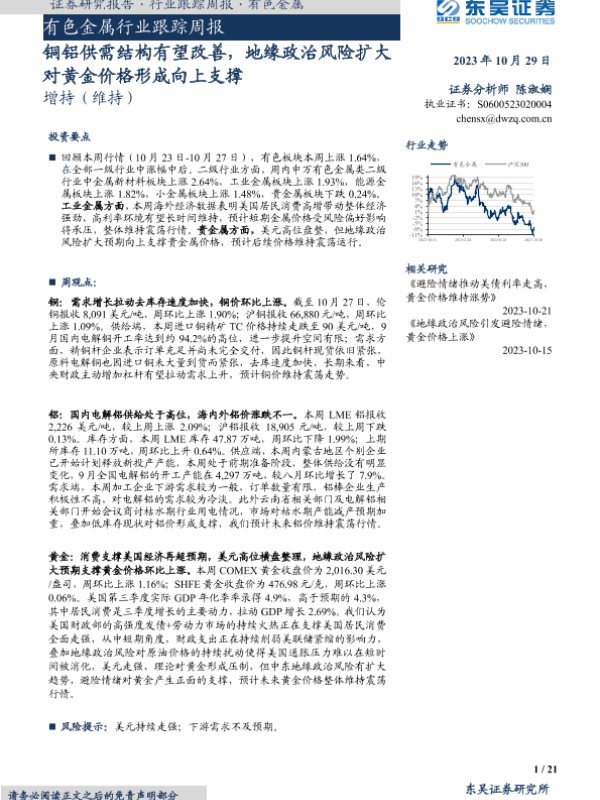 【东吴证券】【20231029】20231029-东吴证券-有色金属行业跟踪周报:铜铝供需结构有望改善,地缘政治风险扩大对黄金价格形成向上支撑-21页