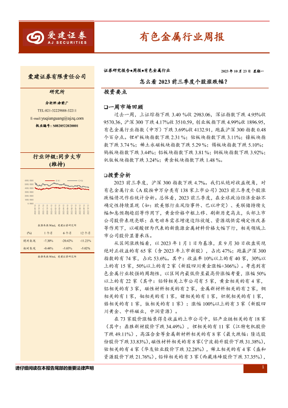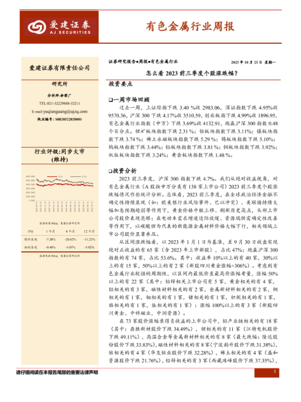 【爱建证券】【20231023】20231023-爱建证券-有色金属行业周报:怎么看2023前三季度个股涨跌幅?-37页