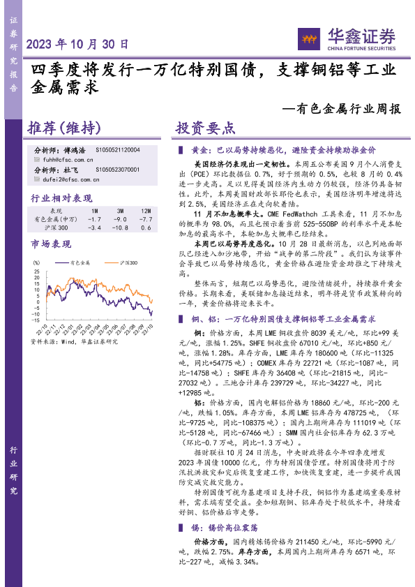 【华鑫证券】【20231030】20231030-华鑫证券-有色金属行业周报:四季度将发行一万亿特别国债,支撑铜铝等工业金属需求-16页