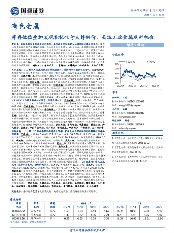 【国盛证券】【20231030】20231030-国盛证券-有色金属行业周报:库存低位叠加宏观积极信号支撑铜价,关注工业金属底部机会-33页