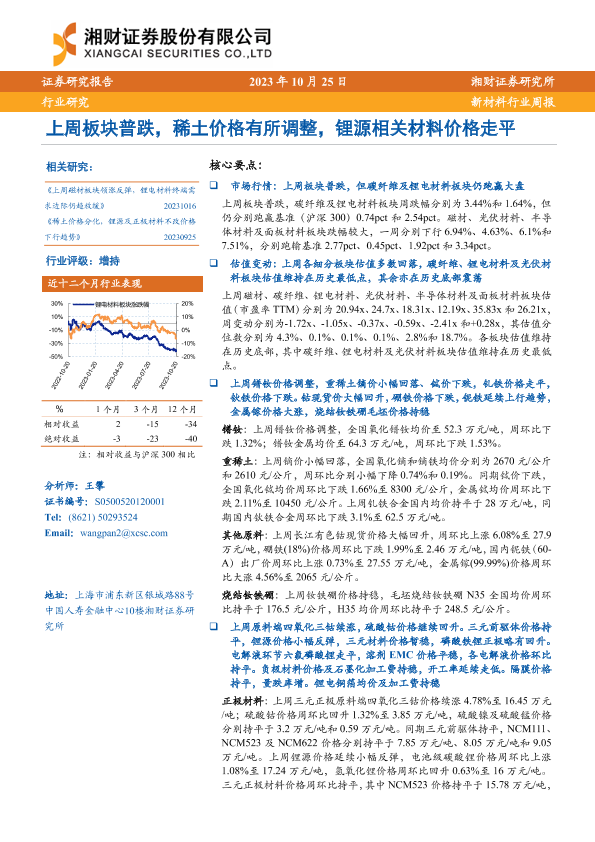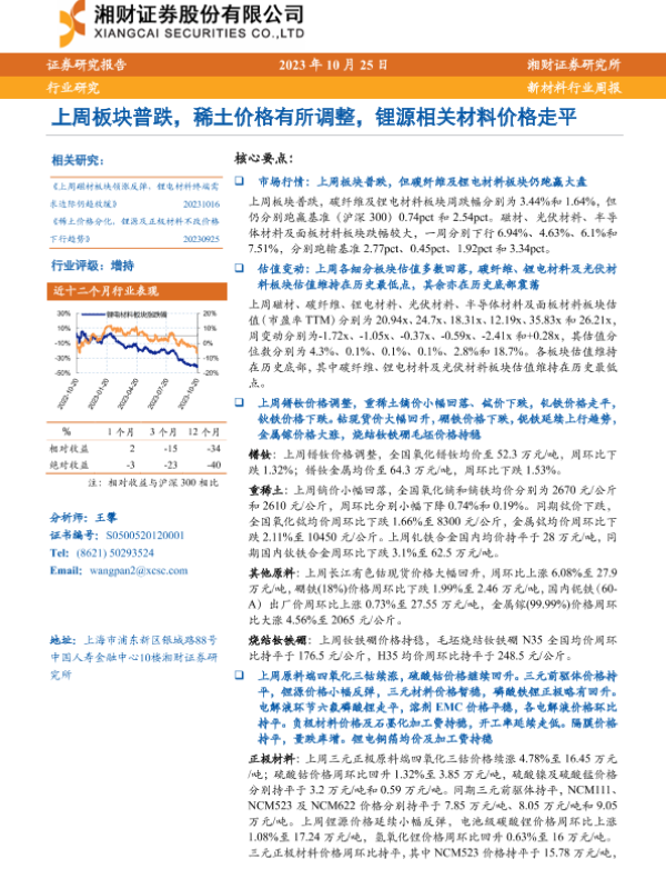 【湘财证券】【20231025】20231025-湘财证券-新材料行业周报:上周板块普跌,稀土价格有所调整,锂源相关材料价格走平-11页