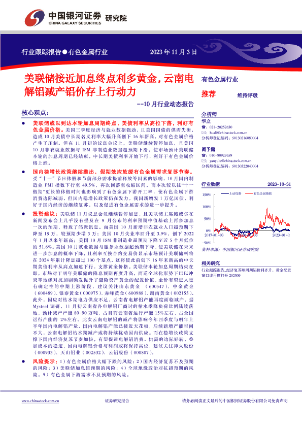 【银河证券】【20231103】20231103-中国银河-有色金属行业10月行业动态报告:美联储接近加息终点利多黄金,云南电解铝减产铝价存上行动力-26页