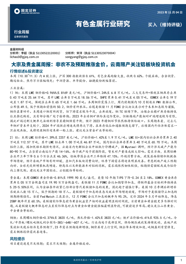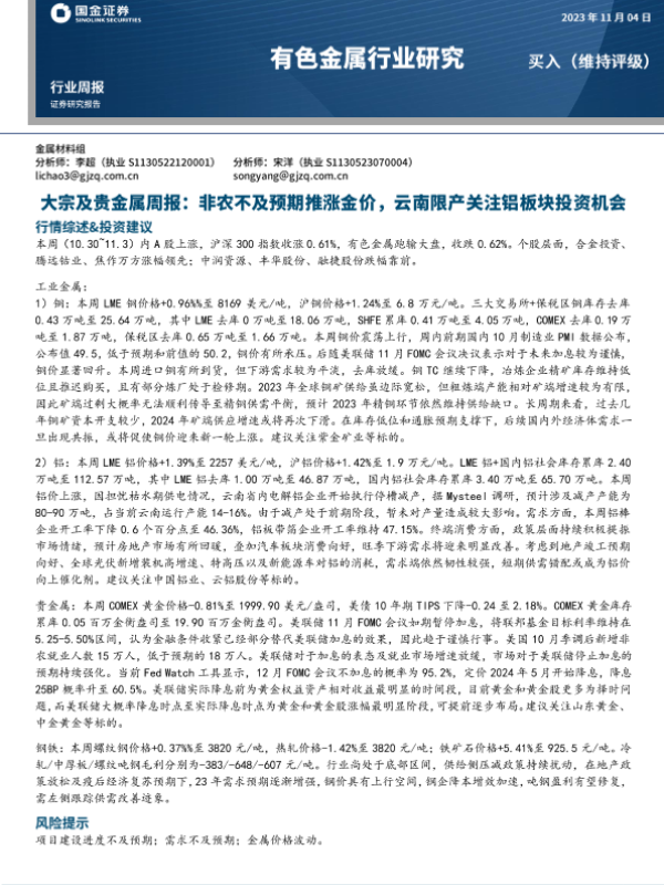 【国金证券】【20231104】20231104-国金证券-大宗及贵金属周报:非农不及预期推涨金价,云南限产关注铝板块投资机会-14页