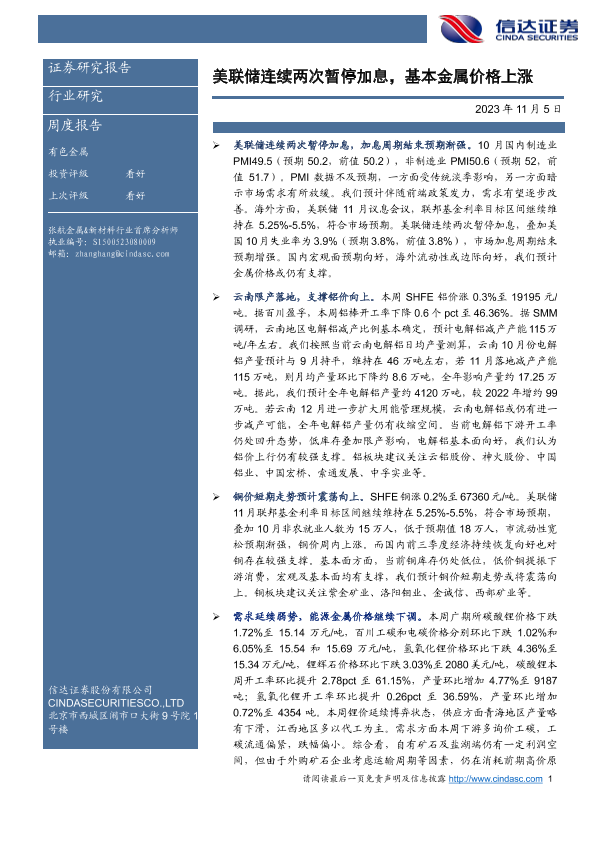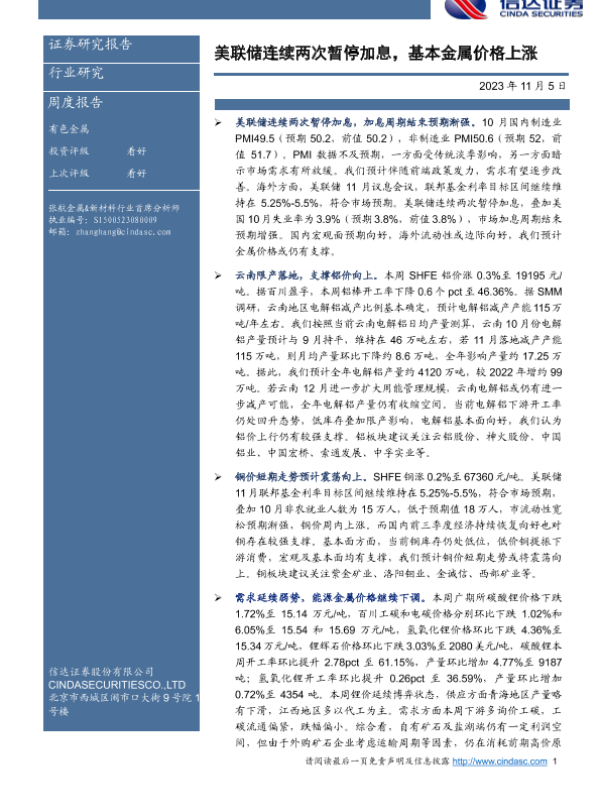 【信达证券】【20231105】20231105-信达证券-有色金属行业研究周度报告:美联储连续两次暂停加息,基本金属价格上涨-12页