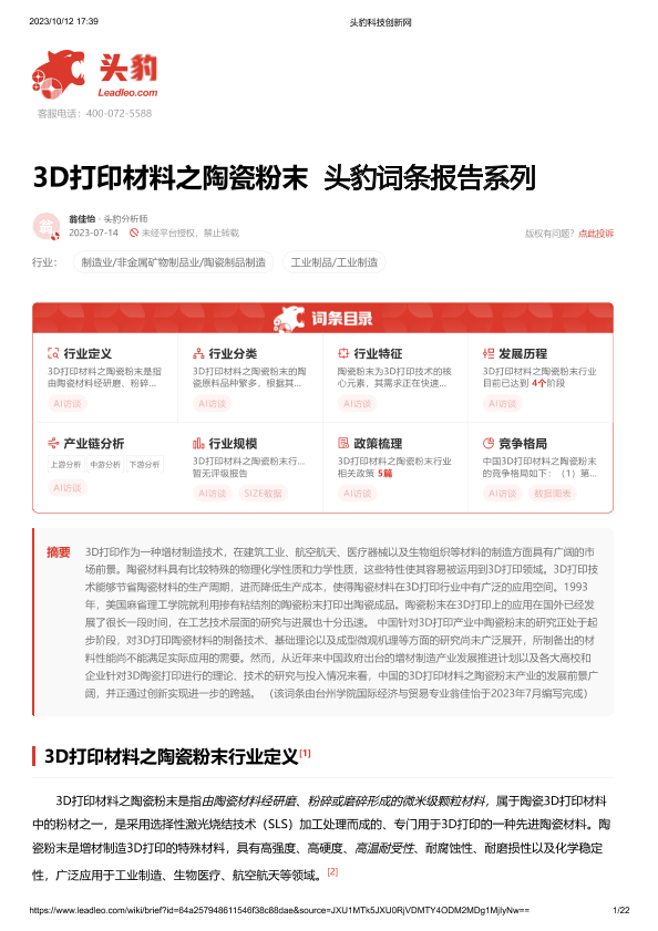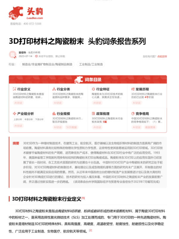 【头豹研究院】【20230714】3D打印材料之陶瓷粉末 头豹词条报告系列-22页