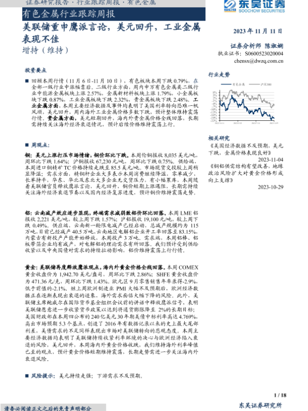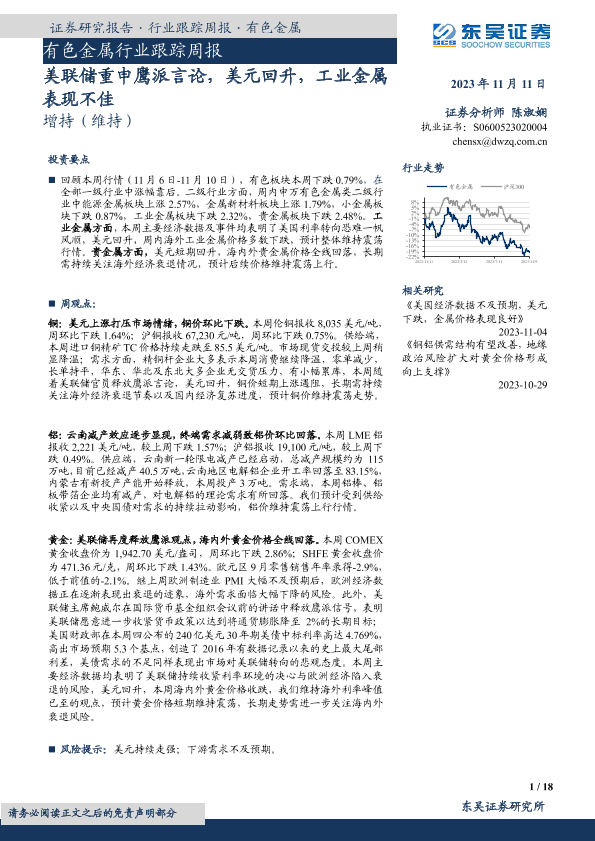 【东吴证券】【20231111】20231111-东吴证券-有色金属行业跟踪周报:美联储重申鹰派言论,美元回升,工业金属表现不佳-18页