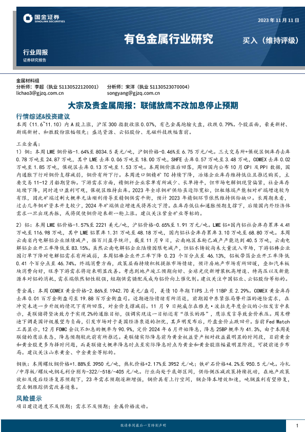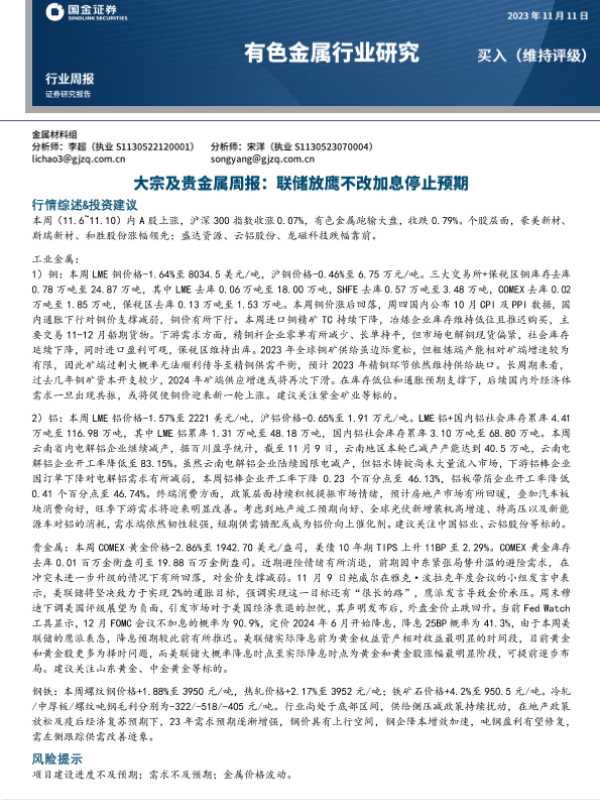【国金证券】【20231111】国金证券-大宗及贵金属周报:联储放鹰不改加息停止预期-14页