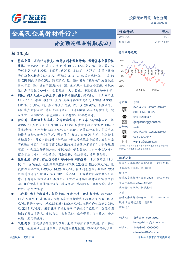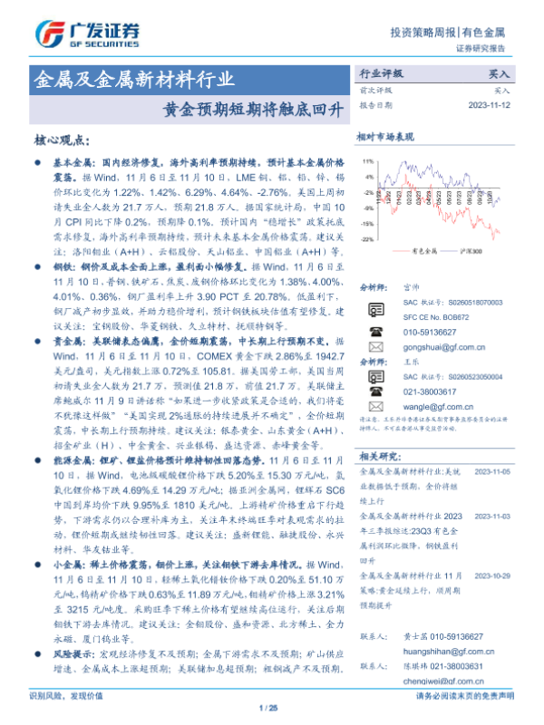 【广发证券】【20231112】金属及金属新材料行业投资策略周报:黄金预期短期将触底回升-25页