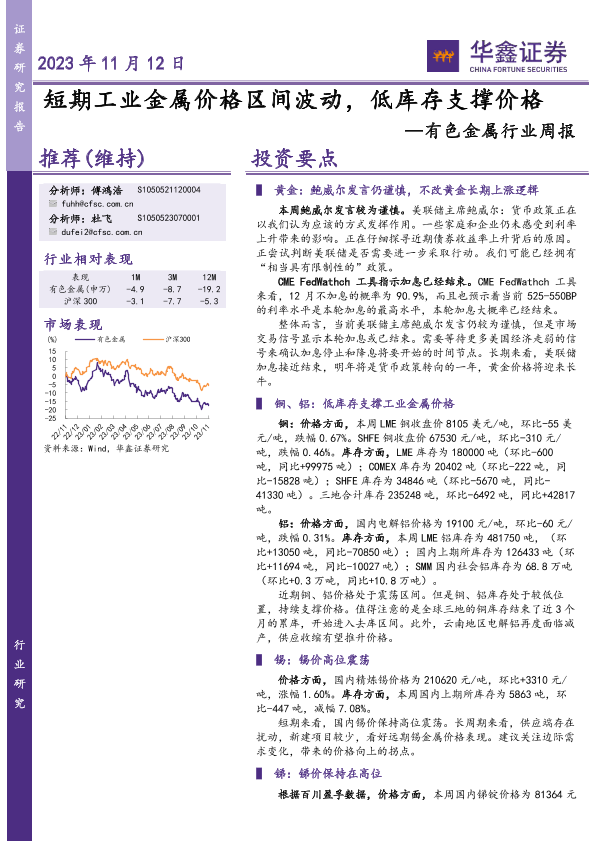 【华鑫证券】【20231112】20231112-华鑫证券-有色金属行业周报:短期工业金属价格区间波动,低库存支撑价格-16页