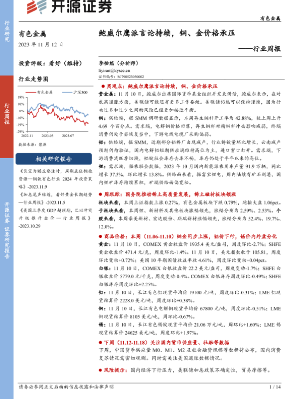 【开源证券】【20231112】20231112-开源证券-有色金属行业周报:鲍威尔鹰派言论持续,铜、金价格承压-14页