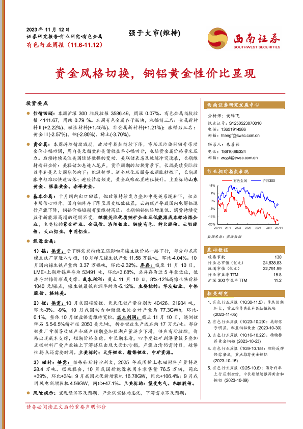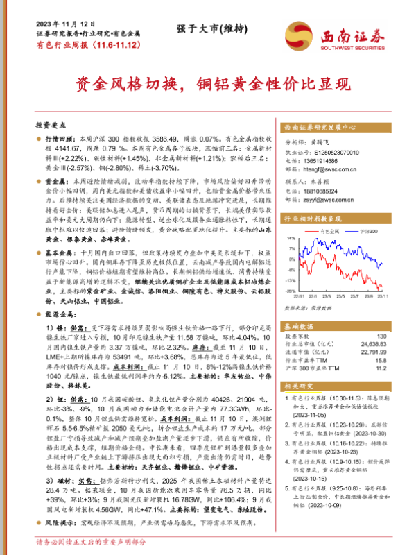 【西南证券】【20231112】20231112-西南证券-有色行业周报:资金风格切换,铜铝黄金性价比显现-24页