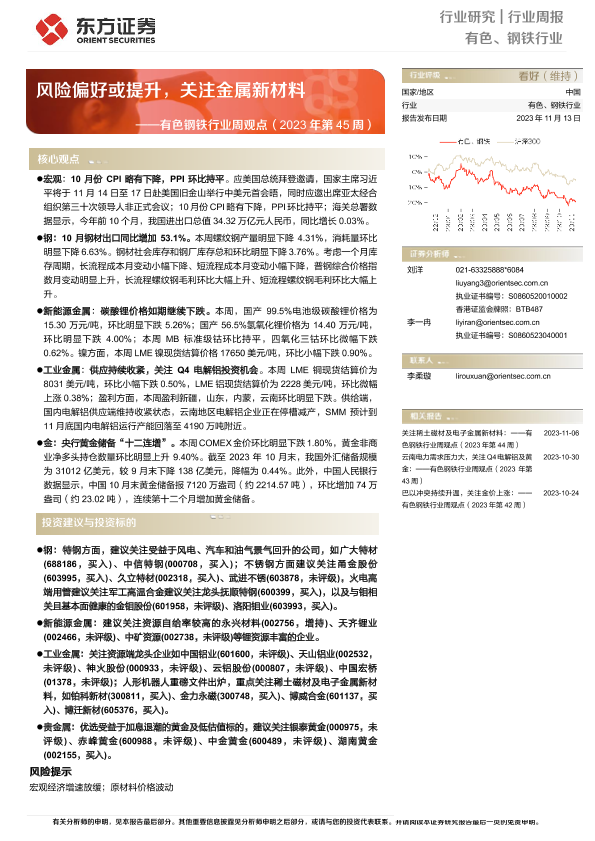 【东方证券】【20231113】20231113-东方证券-有色钢铁行业周观点(2023年第45周):风险偏好或提升,关注金属新材料-39页