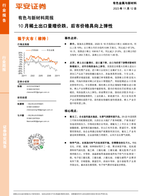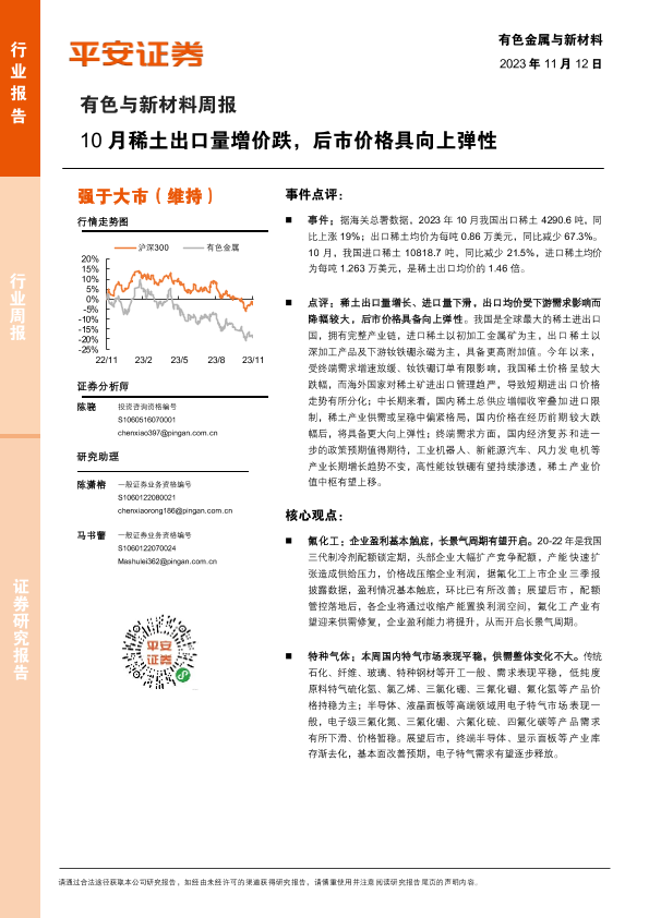 【平安证券】【20231112】20231112-平安证券-有色与新材料周报:10月稀土出口量增价跌,后市价格具向上弹性-15页