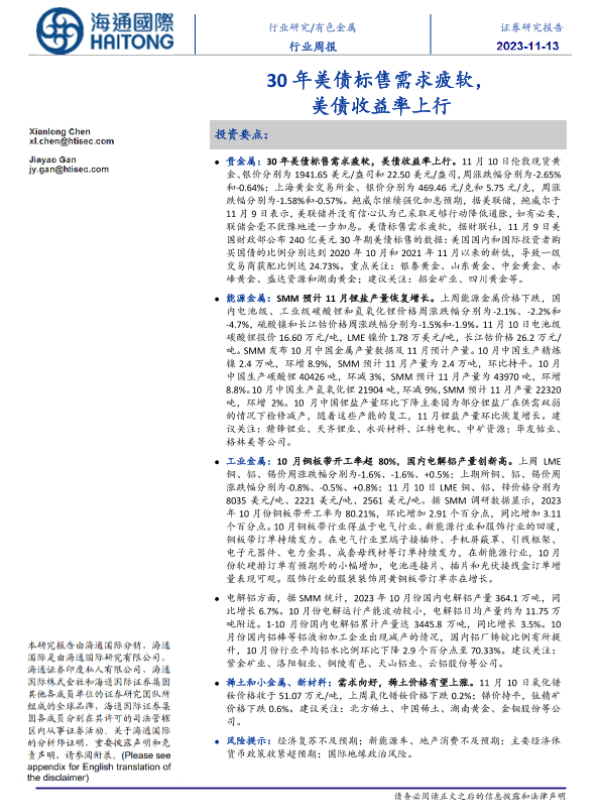 【海通国际】【20231113】20231113-海通国际-有色金属行业周报:30年美债标售需求疲软,美债收益率上行-21页