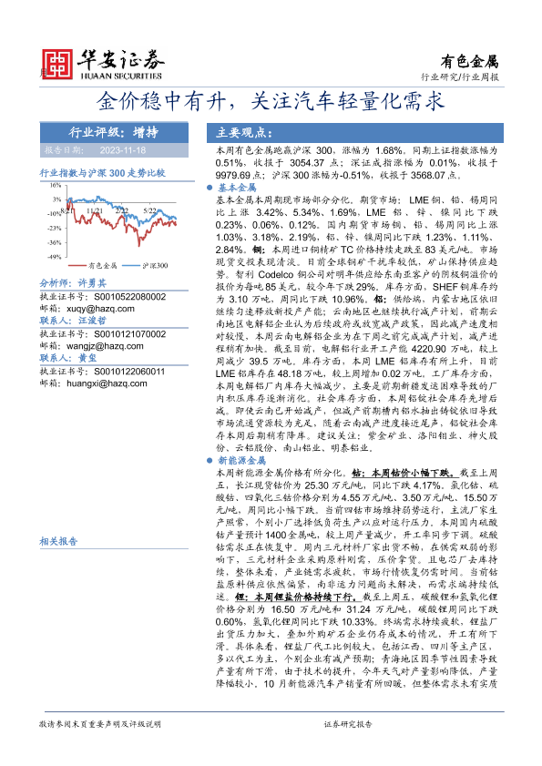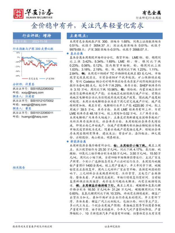 【华安证券】【20231118】20231118-华安证券-有色金属行业周报:金价稳中有升,关注汽车轻量化需求-15页
