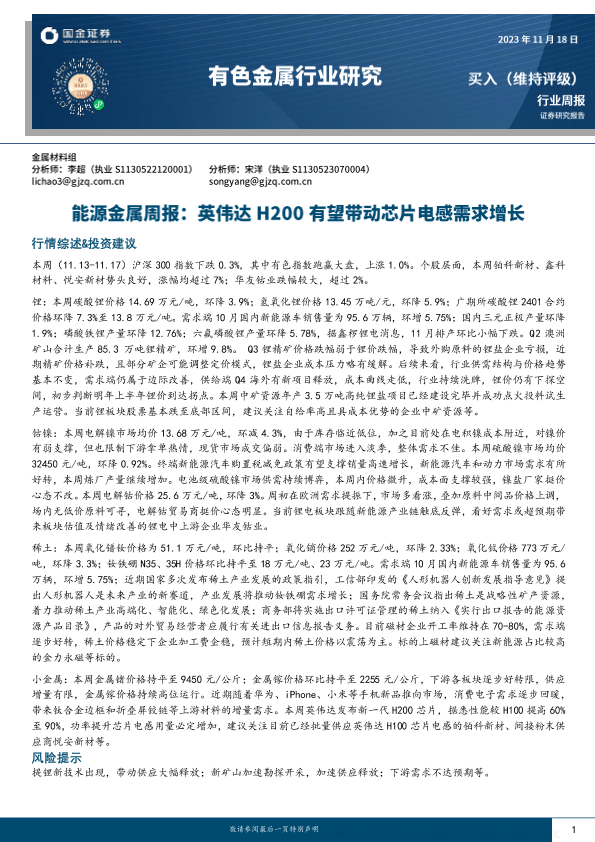 【国金证券】【20231118】20231118-国金证券-能源金属周报:英伟达H200有望带动芯片电感需求增长-15页