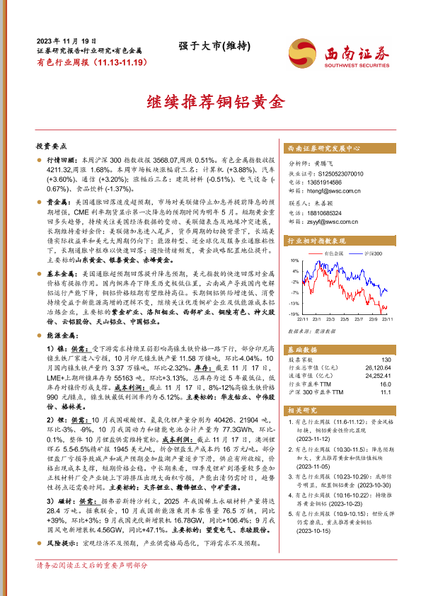 【西南证券】【20231119】20231119-西南证券-有色行业周报:继续推荐铜铝黄金-23页
