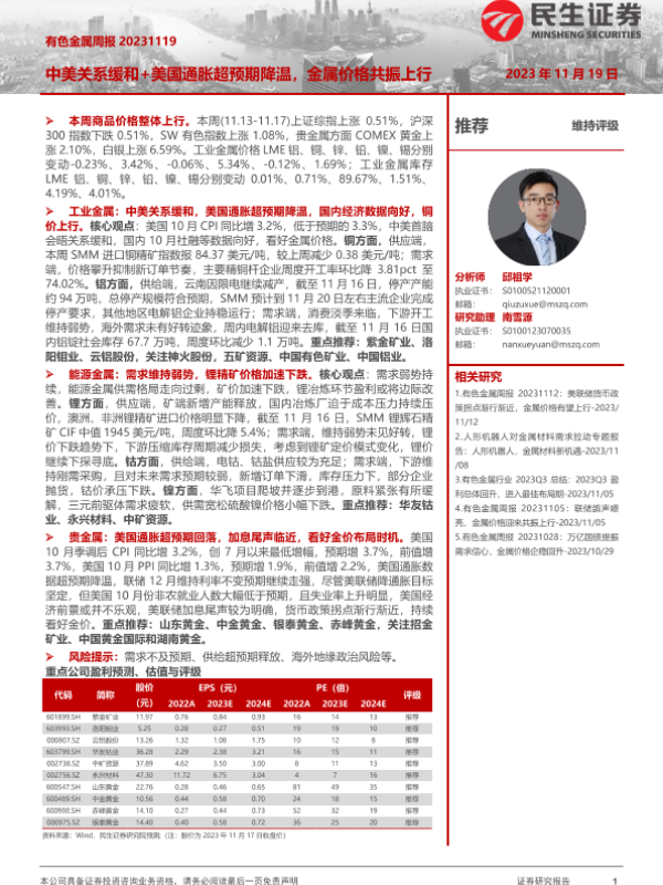 【民生证券】【20231119】20231119-民生证券-有色金属周报:中美关系缓和+美国通胀超预期降温,金属价格共振上行-28页