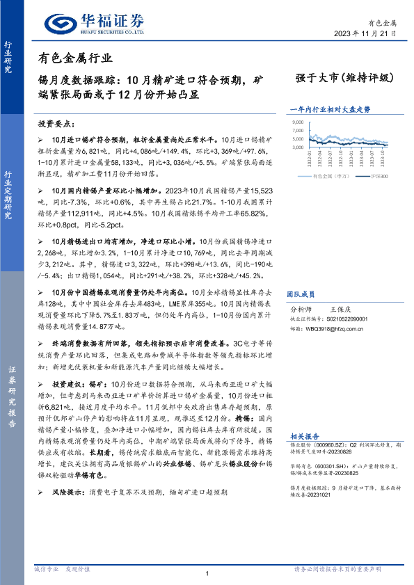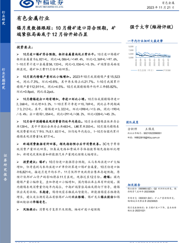 【华福证券】【20231121】有色金属行业:锡月度数据跟踪:10月精矿进口符合预期,矿端紧张局面或于12月份开始凸显-13页