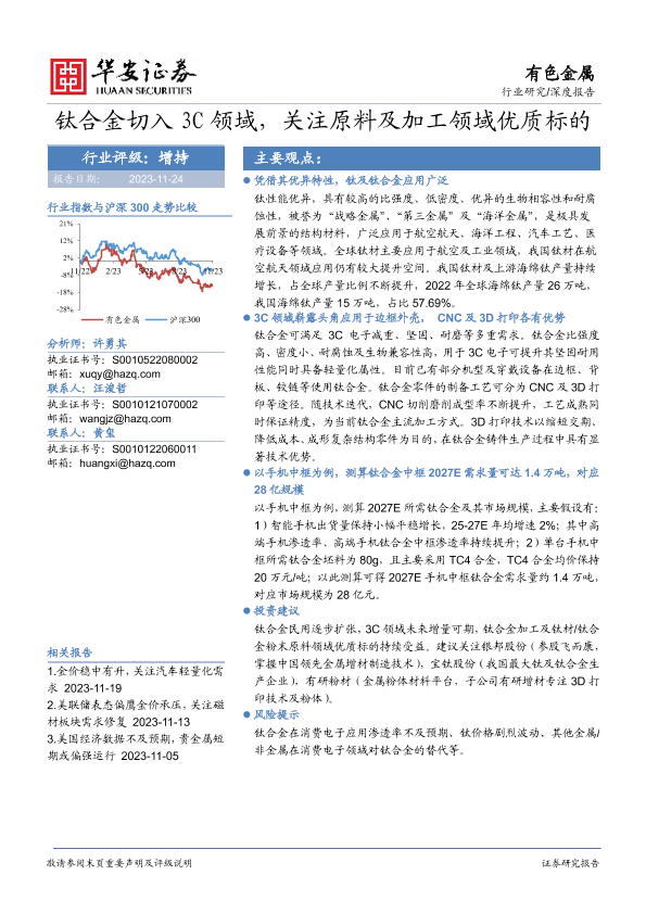 【华安证券】【20231124】钛合金切入3C领域,关注原料及加工领域优质标的-15页